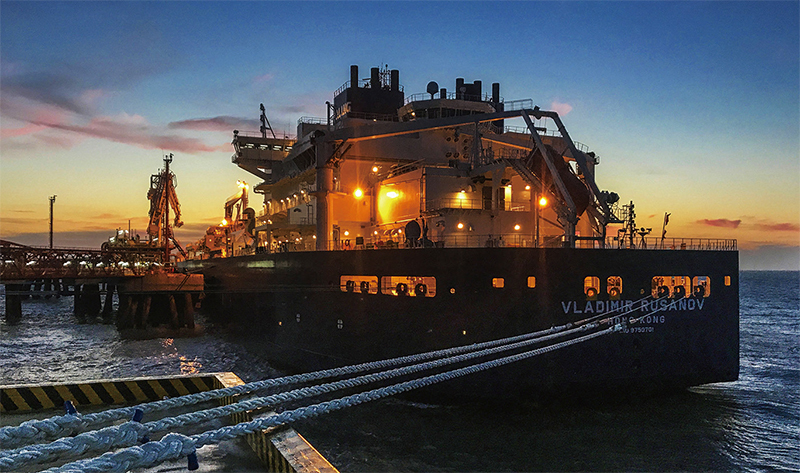 中共利用西方制裁俄羅斯時,趁機低價購買俄羅斯的能源。圖為液化天然氣油輪Vladimir Rusanov從俄羅斯北極亞馬爾半島抵達中國江蘇省南通市的液化天然氣接收站。(China Out/AFP)