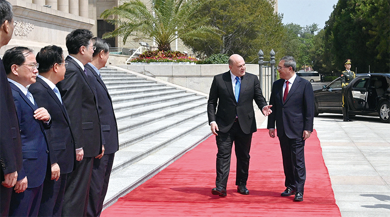 2023年5月24日,俄羅斯總理米舒斯京和中國國務院總理李強在北京出席歡迎儀式。(Alexander Astafyev / SPUTNIK / AFP)