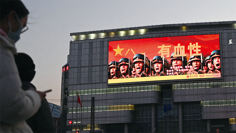 中共是世界和平的最大破壞者,相比之下,普京發動的俄烏戰爭只是小巫見大巫。圖為2023 年3 月2 日,中共兩會開幕前夕北京街頭的軍事宣傳廣告牌。(GregBaker / AFP)