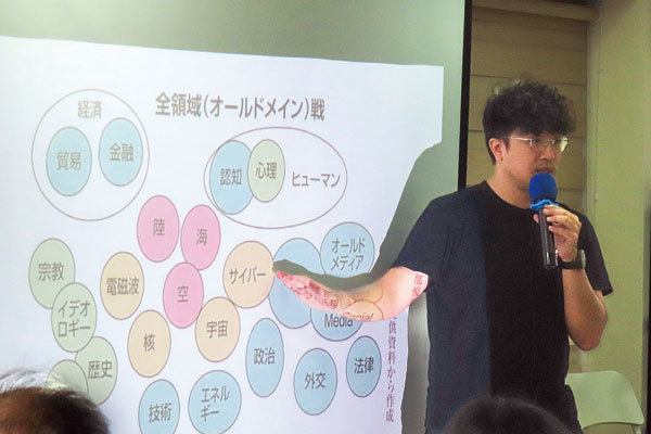 黑熊學院創辦人、台灣民主實驗室理事長沈伯洋強調,台灣人對於中共侵害台灣的本質要有敵國的認識。圖為沈伯洋用一張圖來說明中共對台「全域戰」。(鍾元/大紀元)