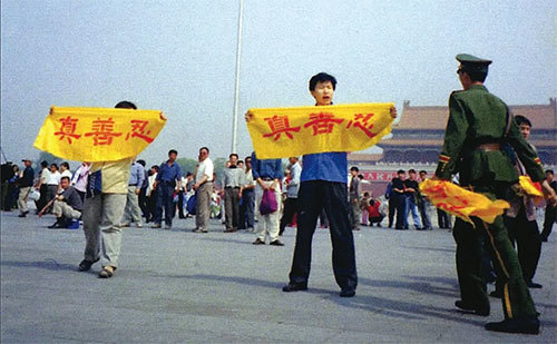 1999年7月,中共對法輪功發動滅絕性的迫害後,成千上萬的法輪功學員冒著生命危險在北京天安門廣場上和平請願,打出「真善忍」橫幅,坦然面對上前抓人的中共警察。(明慧網)