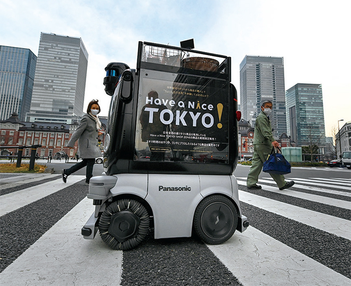 過去的30年,日本在工業製造領域依然處於世界領先地位,重工機械、家電、汽車依然受到全球消費者青睞。圖為2023年1月13日,松下的送貨機器人Hakobo在東京車站附近的商業區出售飲食。(Kazuhiro Nogi / AFP)