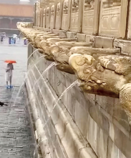 依靠精妙的排水系統,宏大的故宮建築群,在無數次驟雨中仍安然無恙。然而7月22日,號稱六百年從未淹水的紫禁城內汪洋一片,出現「千龍吐水」奇觀。反天反地反人類的中共團伙,毀壞了老祖先們留下的智慧珍寶。