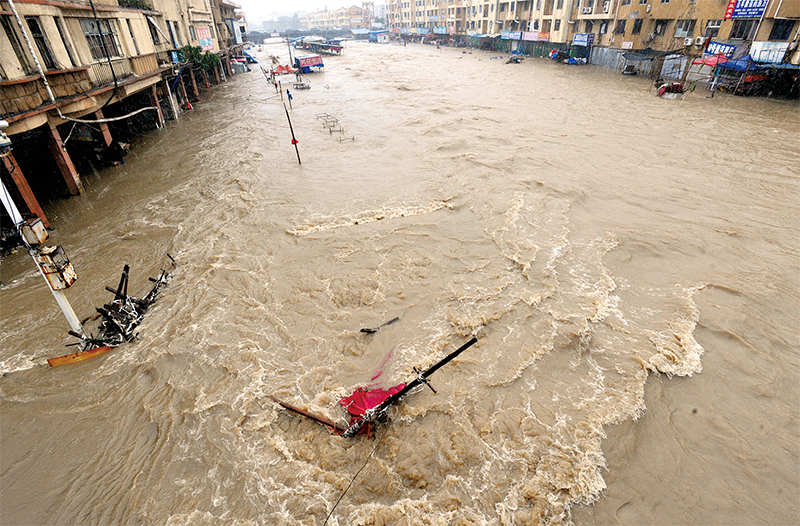 德國人在青島鋪設的地下管網,排水管道中的雨水漏斗帶有反水閥,髒物只進入雨水斗,不會造成管道堵塞,不過這排水功能,現已不復見。圖為2014年7月25日,麥特莫颱風帶來強風及豪雨,致使青島建築物被洪水淹沒。(Getty Images)