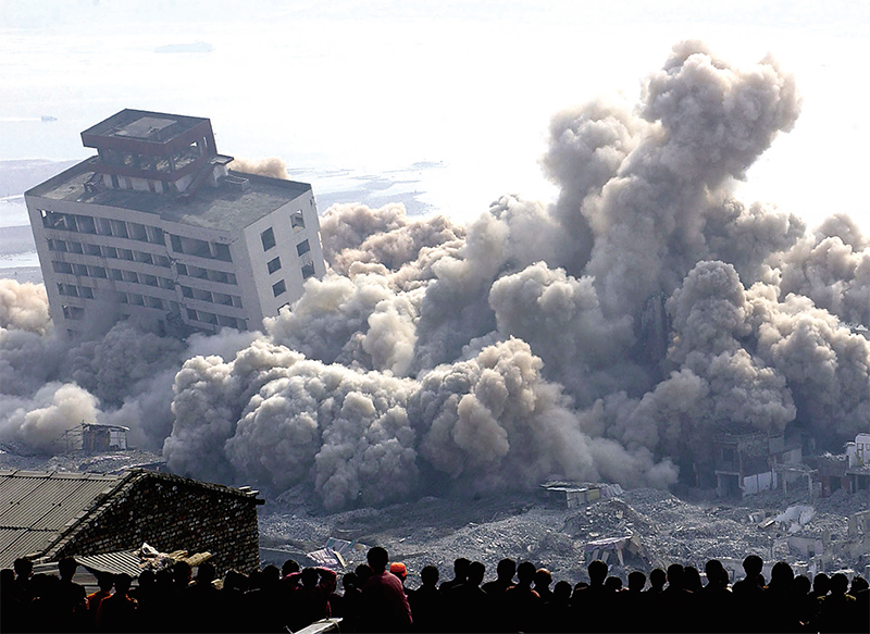中共直到現在,仍然違背天意,延續毛的思想和做法,因此天災人禍不斷。圖為2002年11月,為興建三峽大壩,炸毀重慶市奉節市一座2000多年歷史的部分城鎮。(AFP)