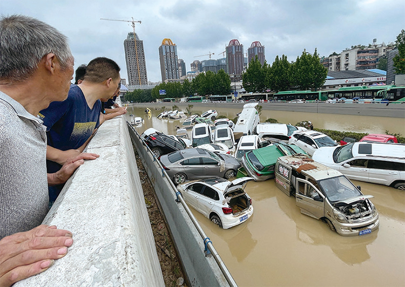 2021年7月21日,河南省鄭州市,被洪水沖走的汽車堆疊在一起。(STR / AFP)