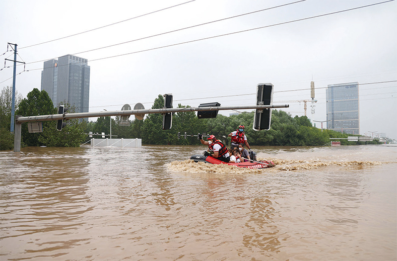2023年8月3日,河北涿州洪災現場,民間救援隊營救居民。(STR / AFP)