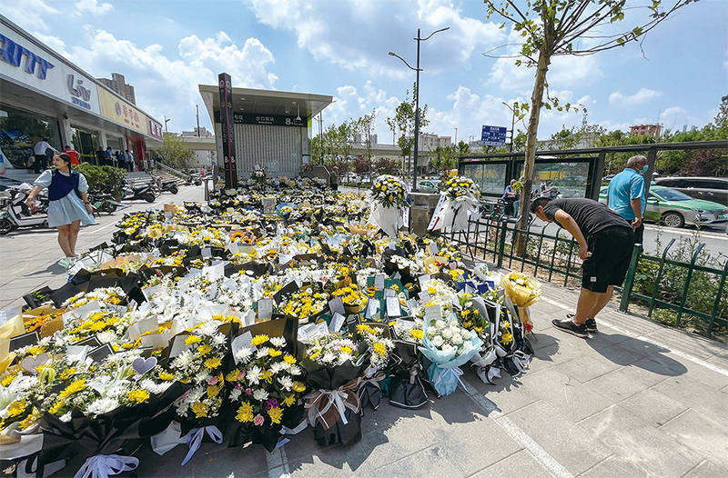 2021年7月27日,鄭州市民在地鐵站前獻花,悼念洪水遇難者。(STR / AFP)