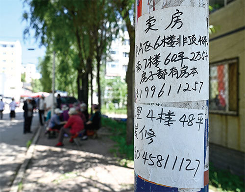 英媒報導,目前中國大量三四線城市的房價大幅下跌,部分城市下跌超過30%,最高跌幅甚至超過50%。圖為2023年7月4日,黑龍江鶴崗市一處住宅小區的待售房屋廣告。(Jade Gao / AFP)