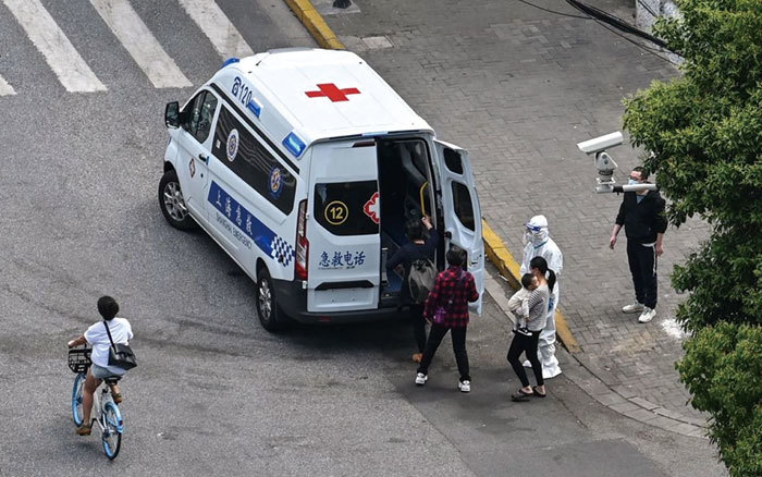 張育軒親眼目睹民眾驗出陽性後,當場被防疫人員套上頭套強行綁上車。圖為2022年5月8日,上海市民被急救車拉走隔離。(Hector Retamal / AFP)