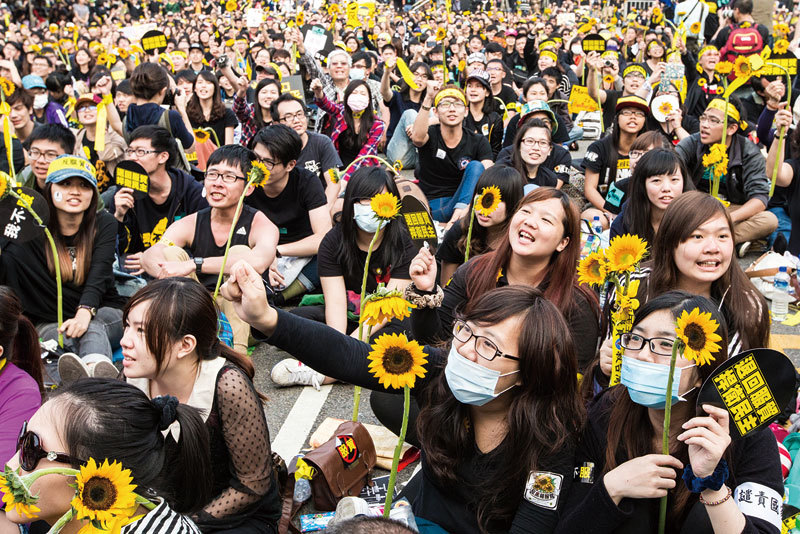 2014年3月18日晚上,台灣反對黑箱服貿的學生及民眾衝進立法院占領議場,開啟「太陽花學運」後,號召超過50萬人走上總統府凱達格蘭大道,拒絕中共黑手伸進台灣。(陳柏州/大紀元)