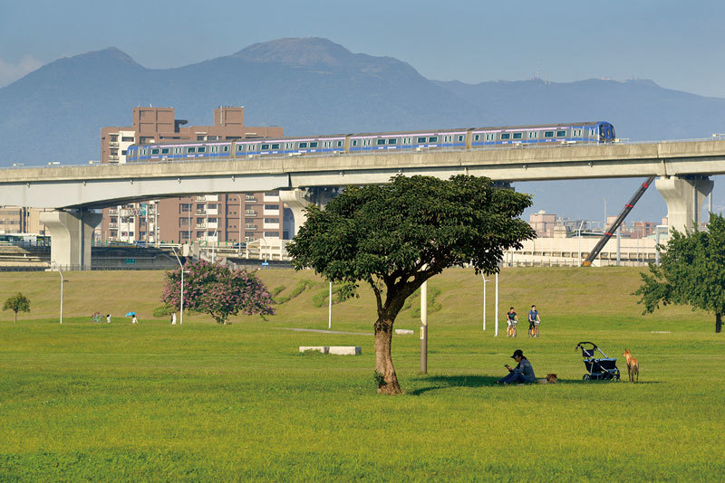 醒悟了的張育軒想對和自己以往一樣的小粉紅說:「醒醒吧,中國是沒有人權的……搬去中國住一段日子試看看,你就知道台灣到底有多美好。」圖為機場列車經過新北市一個公園。(Chris Stowers / AFP)