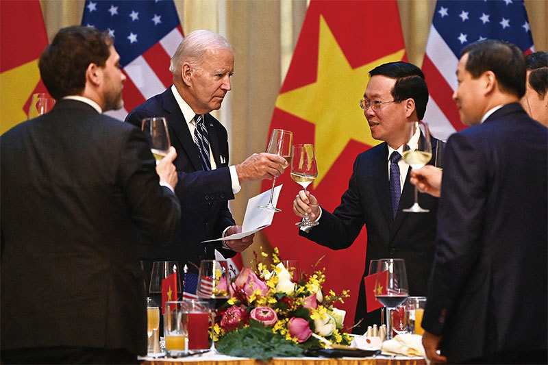美國顯然已經開始將越南視為抗衡中共在亞洲影響力的關鍵。圖為2023年9月11日,美國總統拜登在河內總統府舉行的國宴上與越南總統武文賞(右)舉杯。(Nhac Nguyen / AFP)