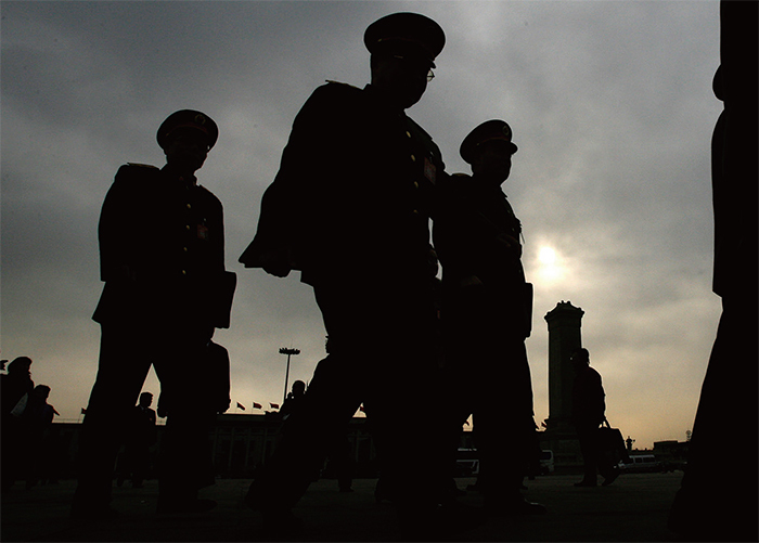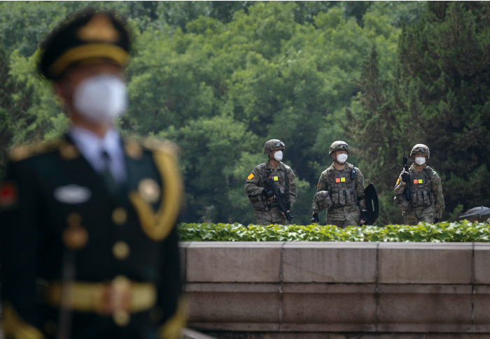 中共內部相互鬥爭,習近平周圍的人蠢蠢欲動,私下結黨。所有被抓的人,對習都不忠。圖為2023年5月26日北京人民大會堂前軍方人員站崗。(Thomas Peter - Pool/Getty Images)