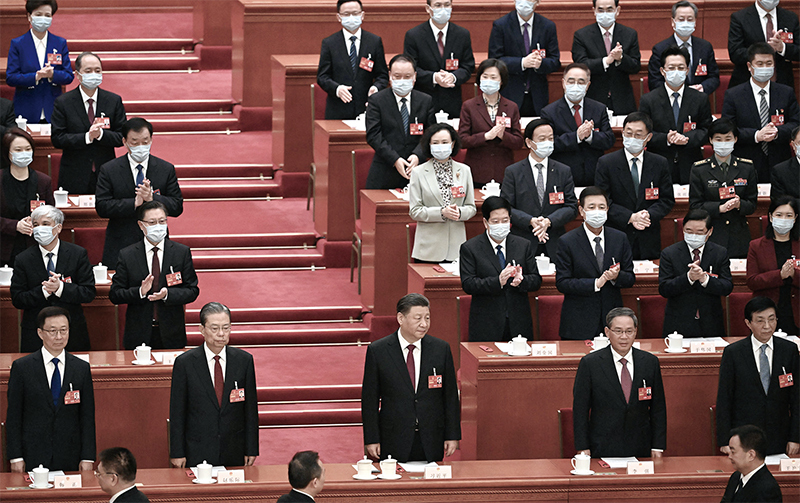 2023年3月10日,中共國務院副總理韓正、中央政治局常委趙樂際、國家主席習近平、中央政治局常委李強、王滬寧出席中共人大會議。(Noel Celis / AFP)