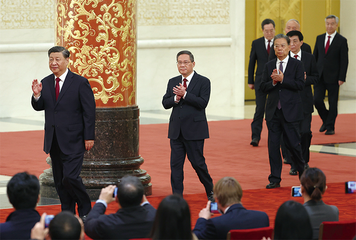 2022年10月23日,習近平、李強、趙樂際、王滬寧、蔡奇、丁薛祥、李希出席二十屆中共政治局常委亮相。(Lintao Zhang/Getty Images)