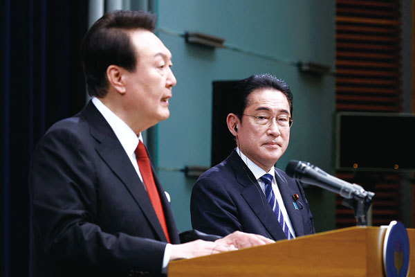2023年3月16日,韓國總統尹錫悅(左)和日本首相岸田文雄舉行了12年來的首次雙邊峰會。圖為聯合新聞發布會。(Kiyoshi Ota / POOL / AFP)