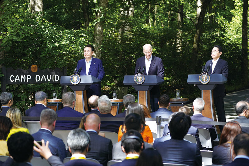 8月18日,尹錫悅(左)和拜登、岸田文雄(右)在美國戴維營舉行韓美日首腦峰會。圖為三國峰會聯合新聞發布會。(Kent Nishimura / AFP)