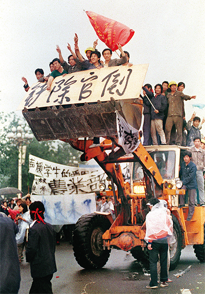 1989年初夏爆發的全國性的「反貪污,反官倒」抗議活動,直接就是針對鄧樸方和鄧小平的。圖為1989年5月18日北京天安門廣場前集會者訴求「剷除官倒」。(Naohiro Kimura / AFP)