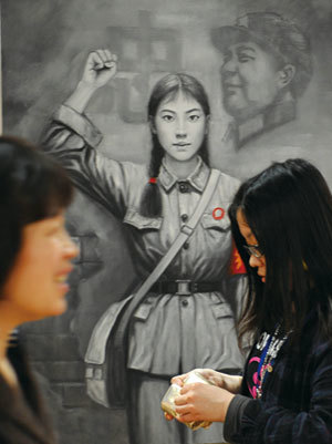 紅二代出身的民運人士表示,造反精神最強的就是文革中形成的幹部子弟這個群體,習近平現在集中力量要打擊幹部子弟,否則自身難保。圖為文革時期的紅衛兵畫作。(Mark Ralston / AFP)