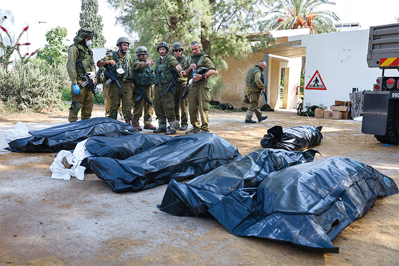 2023年10月10日,以色列士兵收集被哈馬斯屠殺的民眾屍體。(Jack Guez / AFP)
