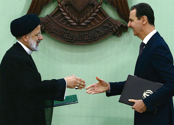 敘利亞被認為是伊朗「最親密的盟友」。圖為敘利亞總統阿薩德(右)與伊朗總統萊希(左)於今年5月在大馬士革簽署「長期戰略合作」備忘錄。(Louai Beshara / AFP)