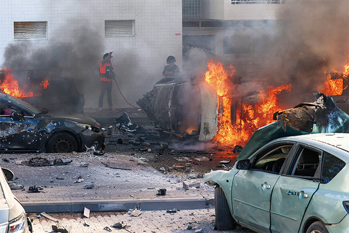 在哈馬斯襲擊以色列、殘酷屠殺1400名以色列人、並在加沙劫持200人質以來,中共不但不譴責哈馬斯,反而說以色列「過度報復」。圖為10月7日,以色列南部城市阿什克隆遭到哈馬斯襲擊。(Ahmad Gharabli / AFP)