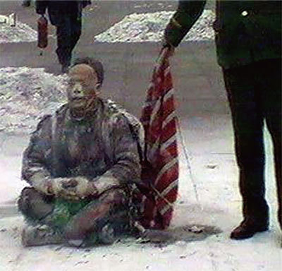 2001年1月23日,中共江澤民集團一手導演天安門自焚偽案,誣陷法輪功。圖為其中一名「自焚者」王進東,在自焚後,他的頭髮與腳上的塑料雪碧瓶卻完好無損。(視頻截圖)