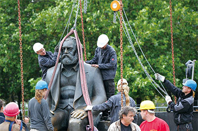 習什麼時候變壞的?就在他為了鞏固權力,竭力吹捧馬列主義時,就等於上了賊船。圖為2010年,德國工人正在移除柏林的一座馬克思雕像。(Joannes Eisele / AFP)