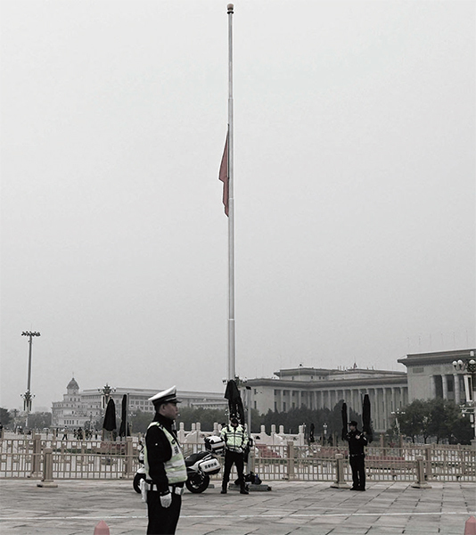 2023年11月2日,李克強的遺體火化日,北京風聲鶴唳。圖為中共在天安門廣場為去世的李克強降半旗,警察控制了廣場。(Pedro Pardo / AFP)