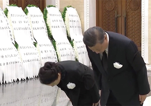 這次告別儀式上有一個罕見情況:中共黨魁的夫人彭麗媛也出現了。習與程虹握手時,表情冷漠,而身後的彭麗媛則神情哀傷,一度要哭出來。兩人向李克強三鞠躬時,習的表情仍舊漠然,而彭麗媛鞠躬時身體幾乎曲成90度。