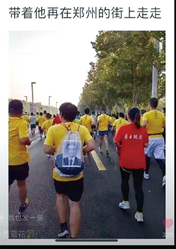 在鄭馬現場,一位穿黃衫的選手,背上背著一個透明袋子,內放A4紙印的李克強黑白遺照,特別引人注目。