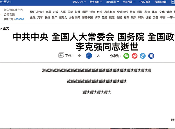 2023年10月27日,網路傳出中共喉舌發表時間為今年2月3日的新華網「李克強訃告」測試文。(網頁截圖)