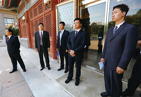中共黨魁對自身的安全提心吊膽,上任十年換了四個中央警衛局長。前警衛局長王少軍2022年4月26日因病逝世,死後三個月、7月24日才發喪,死因令人懷疑。圖為中南海保鏢。(Jim Bourg / AFP)