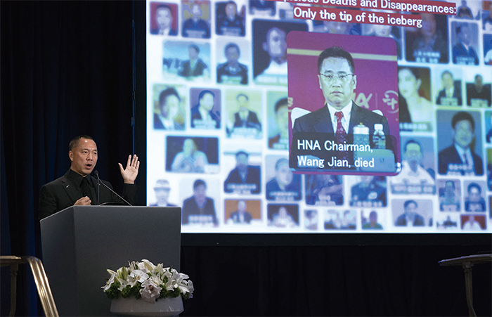 2018年11月20日流亡美國的中國富豪郭文貴在紐約公布他發現的海航集團創辦人王健死因疑點。(Don Emmert / AFP)