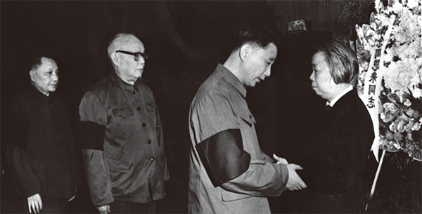 《文匯報》頭版影射「周恩來要把鄧小平扶上台」。圖為1976年1月15日,鄧小平(左一)在北京向周恩來遺孀鄧穎超致意。(Xinhua / AFP)