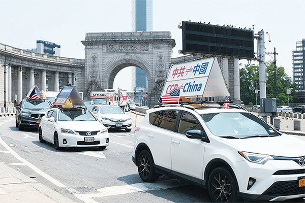 為了混淆視聽,中共和恐怖組織都將自己與國家混為一談,灌輸「中共就是中國」,「哈馬斯代表巴勒斯坦人民」。圖為2023年7月1日紐約市區的「打倒中共惡魔」車遊。(全球退黨服務中心提供)