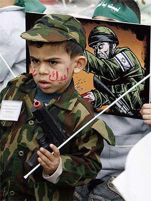 在哈馬斯內部,兒童從小就被進行思想俘虜,被灌輸仇恨和鬥爭的意識形態。圖為2009年1月19日,一名穿著軍裝的巴勒斯坦小男孩。(Ramzi Haidar / AFP)