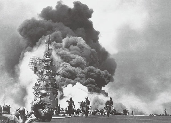 1945年3萬噸級美國碉堡山號航空母艦在沖繩之役遭到神風特攻隊自殺攻擊。(公有領域)