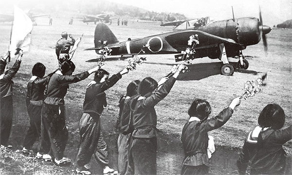 年輕人心中的櫻花,是理想、愛情和生命,卻不知不覺跟邪惡的軍國主義與王權結合在一起。圖為知覽町的女高中生向準備起飛的神風敢死隊飛行員揮舞櫻花樹枝告別。(公有領域)