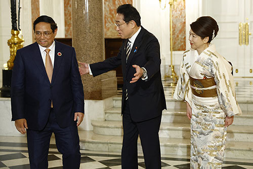 中共黨魁剛離開越南,越南總理范明政就前往日本出席東盟與日本關係50周年紀念峰會。圖為2023年12月16日范明政(左)受到日本首相岸田文雄夫婦在東京迎賓館的接待。(Kim Kyung-Hoon / AFP)