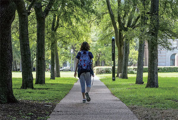 2022年8月29日,德州休斯頓一所大學校園,一名大學生正走在寧靜的校道上。(Brandon Bell / Getty Images)