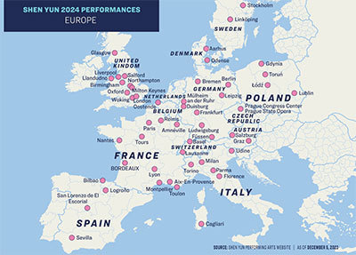 在歐洲,神韻將到訪至少12個國家50多個城市,上演數百場演出。(孫明國製圖)
