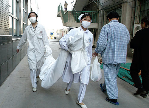 二千多年前的《啟示錄》準確預言了第一場大瘟疫在中國降臨的時間,同時變相警示世人:薩斯瘟疫是因為迫害法輪功而遭來的天懲。圖為2003年4月7日,北京一家醫院的中國護士。(Goh Chai Hin / AFP)