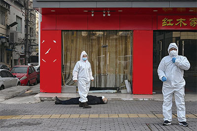 2020年1月30日,法新社記者在武漢直擊、拍攝到一名戴著口罩老人倒斃在武漢一家醫院附近的一條街上。(Hector Retamal / AFP)