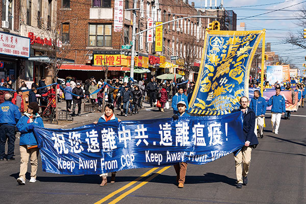 2020年疫情初期,據統計,80%染疫者是黨員,病毒專門針對中共黨徒和幫凶。圖為2020年3月1日,法輪功學員在紐約布魯克林遊行,傳遞避疫良方。(戴兵/大紀元)