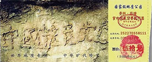 中國貴州省平塘縣掌布鄉發現的藏字石及旅遊點舊版門票,「中國共產党亡」字清晰可見。(明慧網)