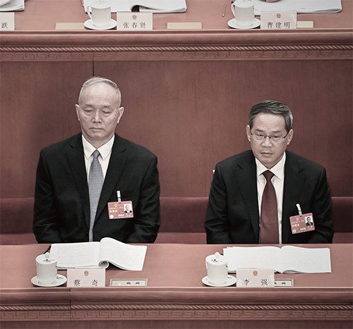 2023年3月7日,蔡奇(左)、李強在中共人大會議上。(Greg Baker / AFP)