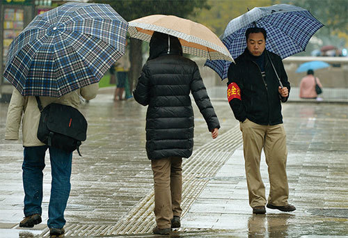 「楓橋經驗」成為控制在中共基層政府手中的一個暴政工具。圖為北京街頭戴紅袖章的社會維穩人員在街頭監控過往行人。(Mark Ralston / AFP)