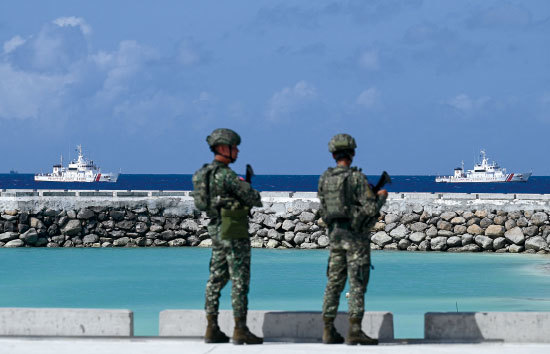 2023年12月1日,菲律賓士兵在有爭議的南海中業島附近觀看菲律賓海岸警衛隊船隻。(Jam Sta Rosa / AFP)